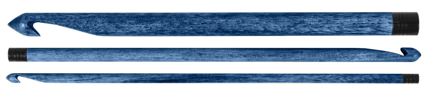 Lykke Indigo 6" birchwood crochet hooks. Made of strong birchwood and tinted in Indigo for the Indigo collection. All hooks have sizes on the bottom of each hook. A smooth and comfortable hook to work with.