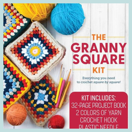 Start crocheting your own colorful granny squares with this all-in-one kit—includes a project book, a hook, a needle, and two colors of yarn.
